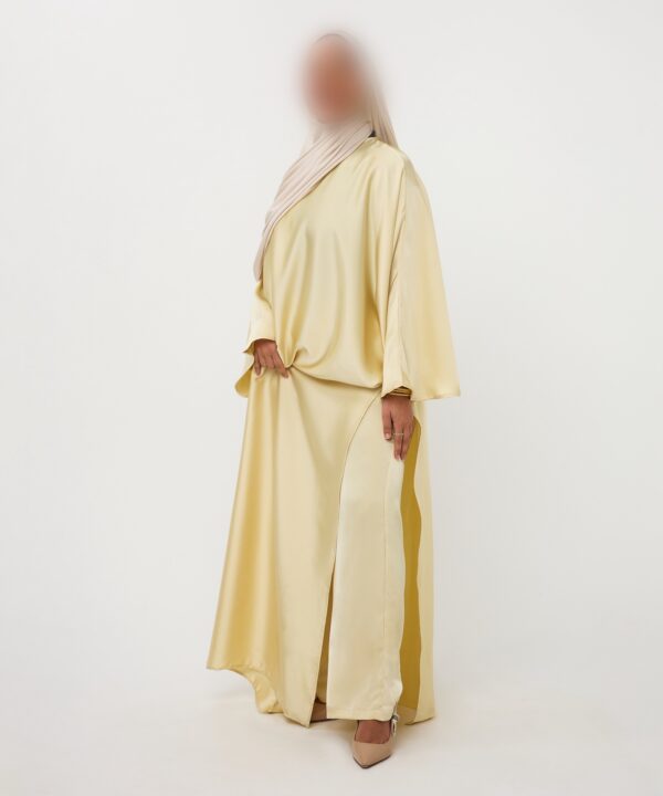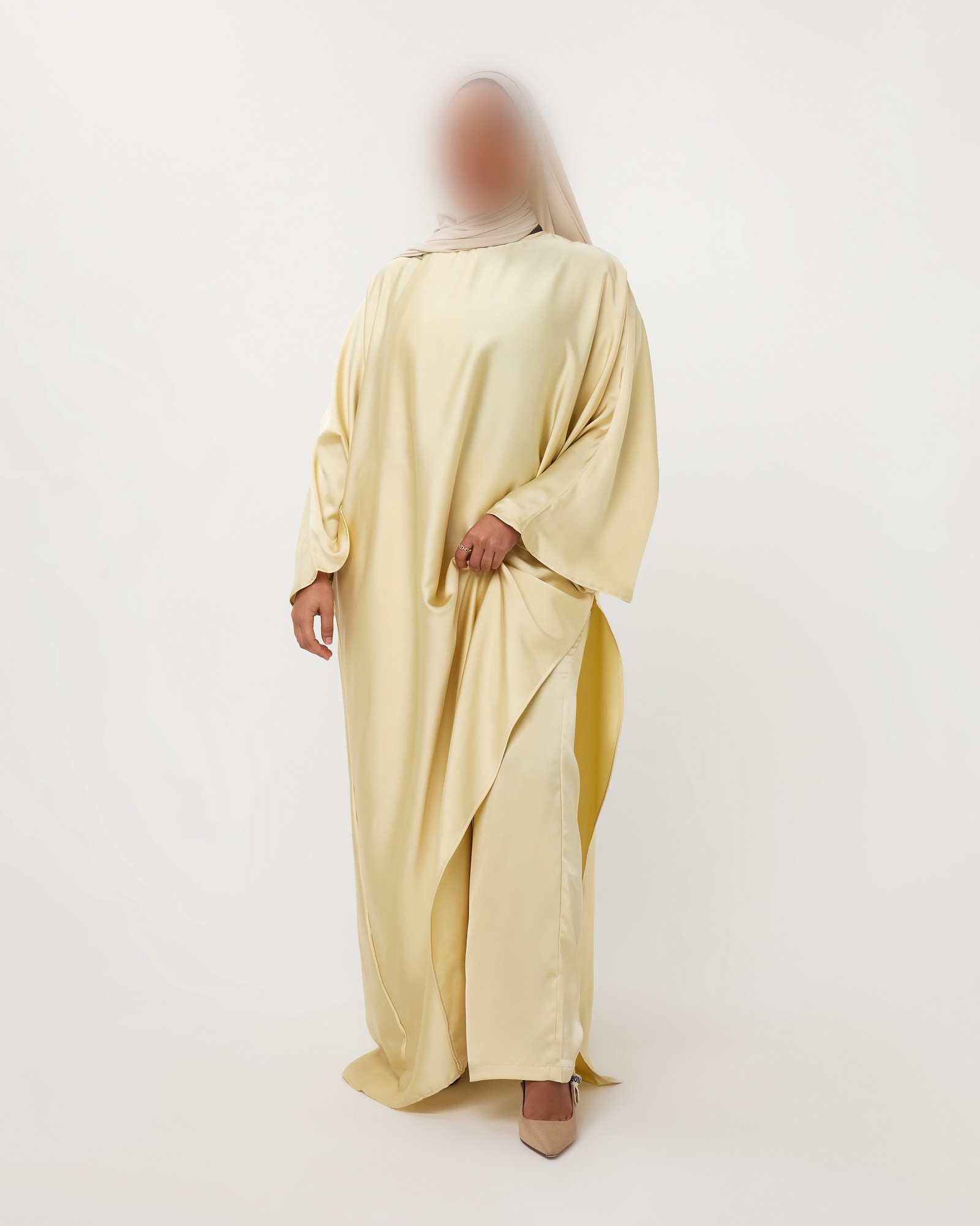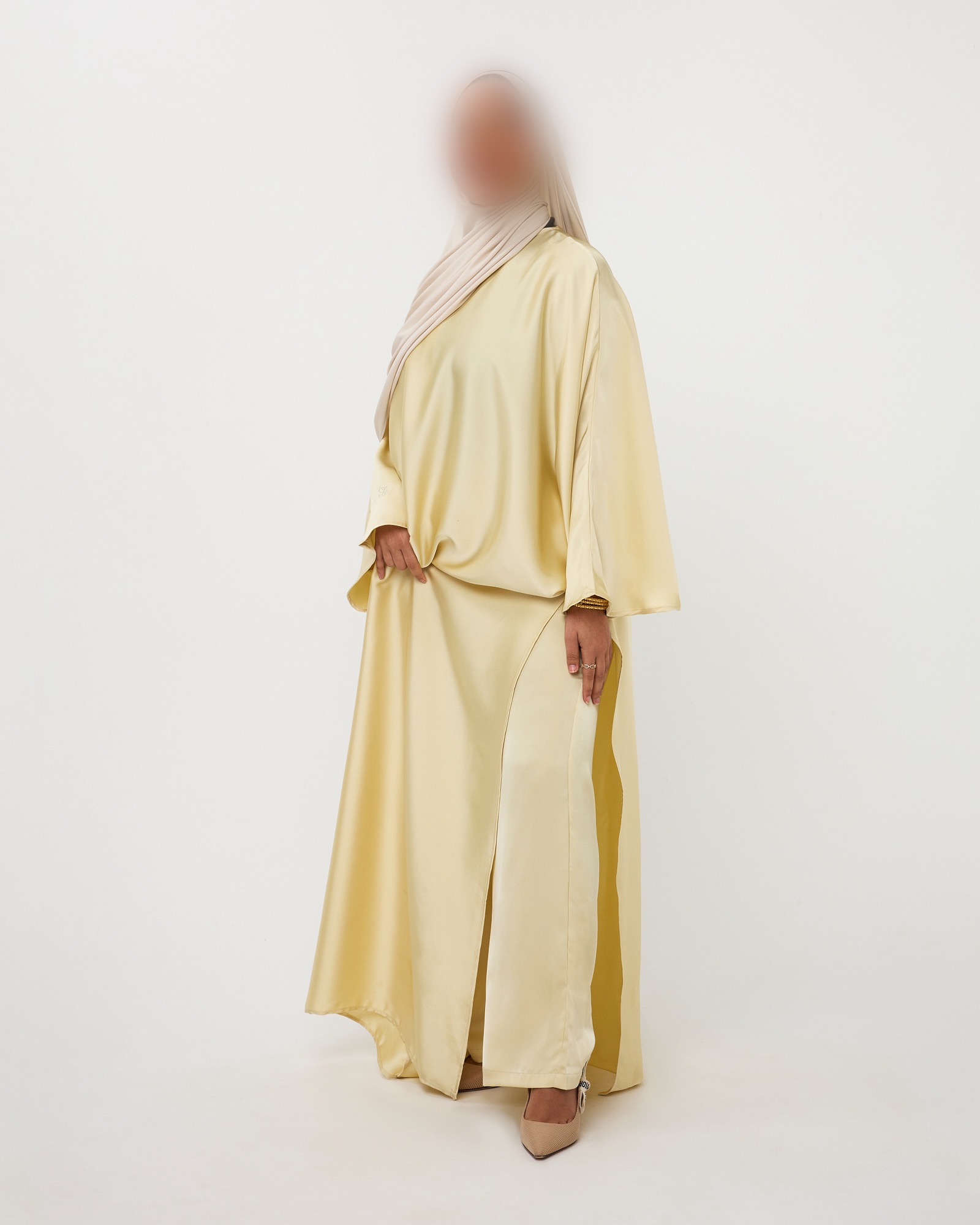 MOOIE TWEEDELIGE SET MET PANTALON. DE JURK HEEFT EEN SPLIT VANAF DE HEUP TOT DE ENKEL. HET MODEL IS 1M60 EN DRAAGT MAAT SM.