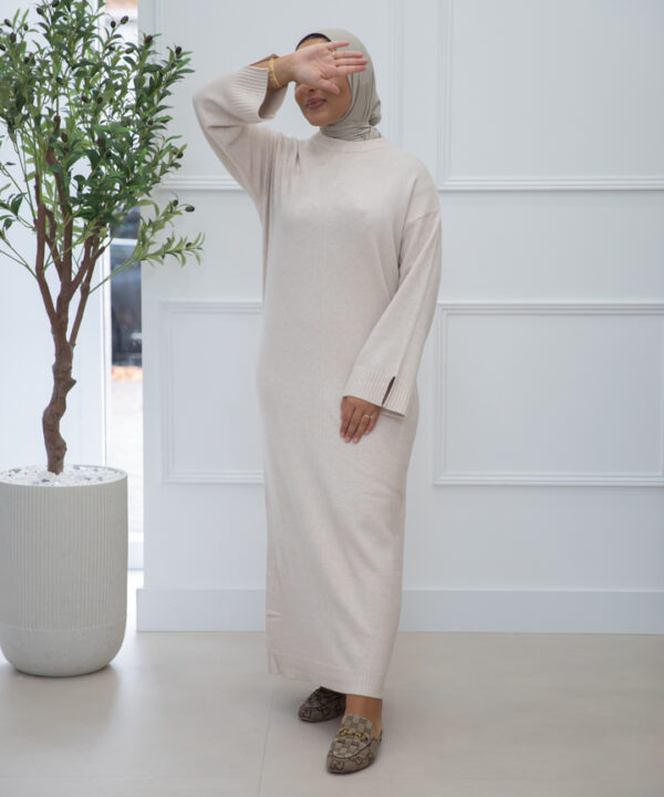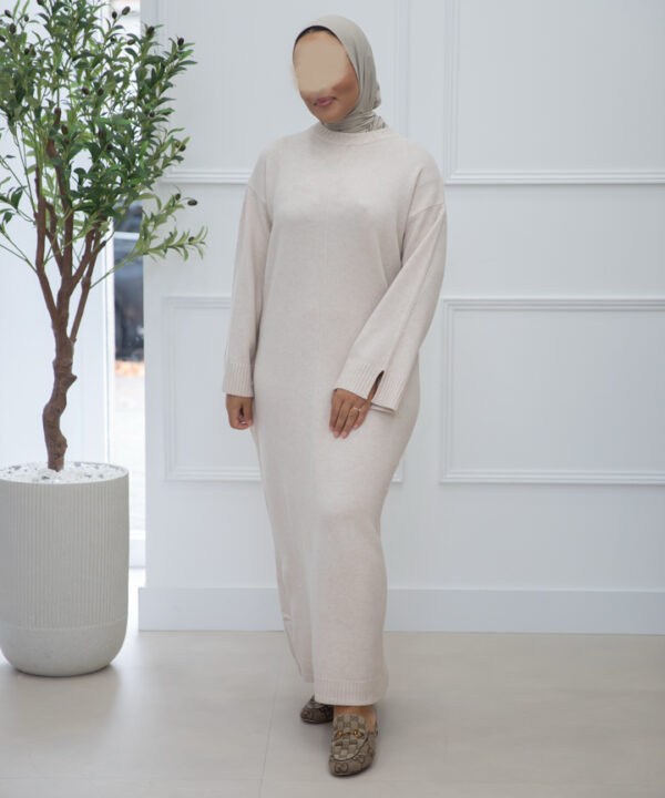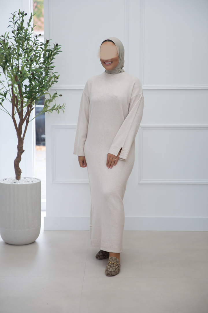 LEUKE SWEATERJURK MET SPLIT. DE JURKEN VALLEN OP MAAT. HET MODEL IS 1M60 EN DRAAGT MAAT SM.